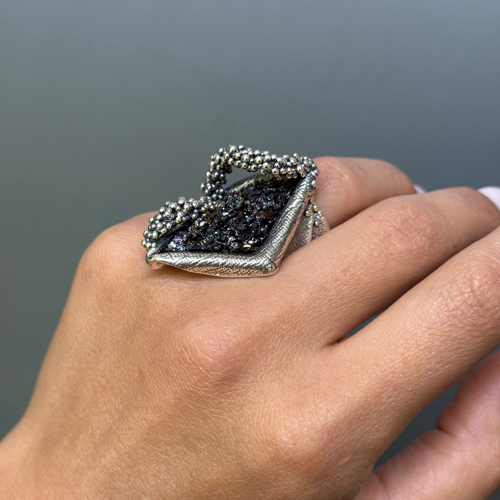 An original handmade silver ring featuring a unique carborundum stone.